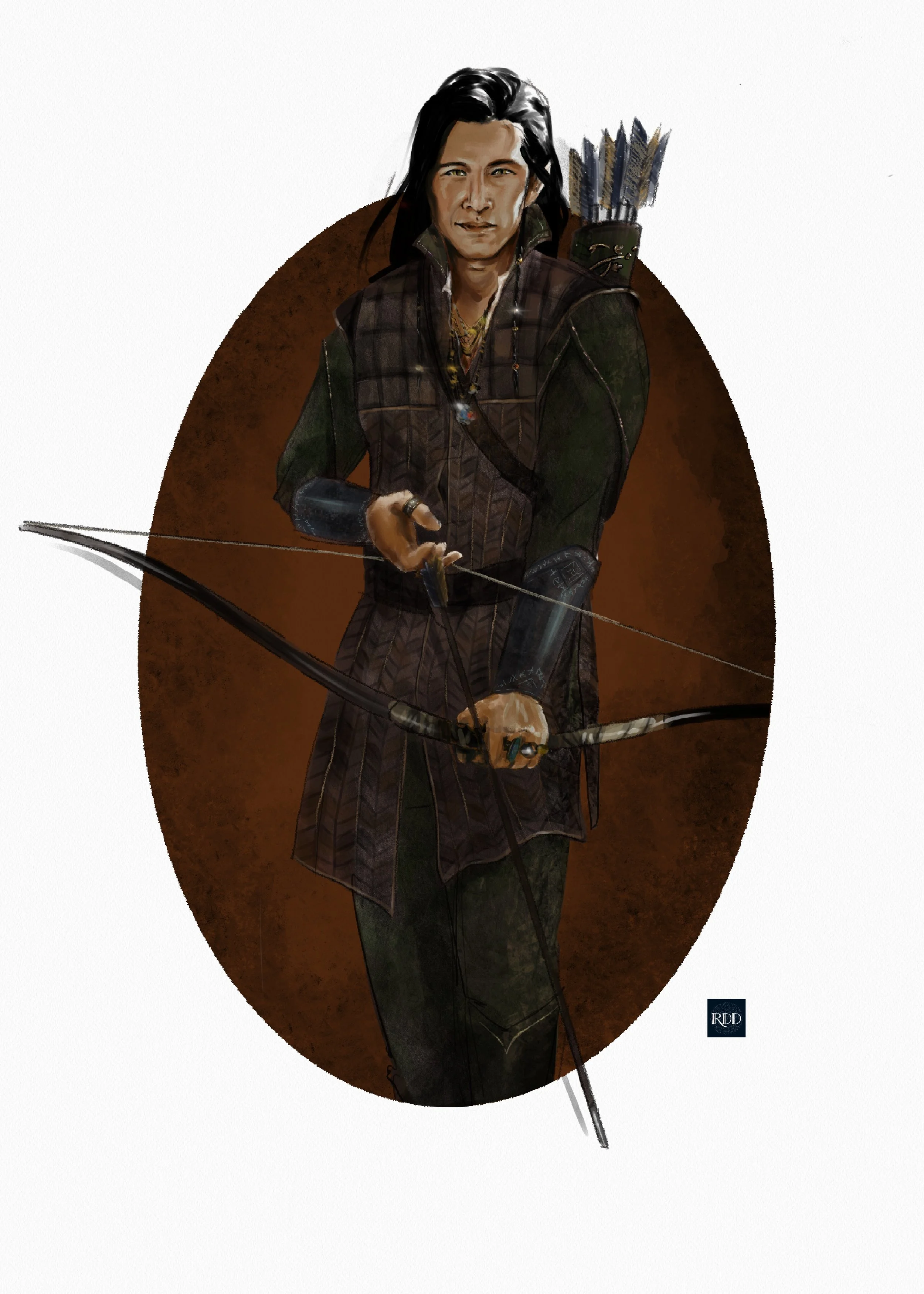 Praedis Naïlo is a wood elf rogue played by one of my oldest friends. Because he’s a memeber of one of my parties, I got to know Praedis quite well before ever drawing him, but even so, a wood elf dressed in mostly brown and forest green is a tricky thing to make unique, and … not Legolas. (No shade! my first couple of PCs are woefully generic, although I am very fond of them.)